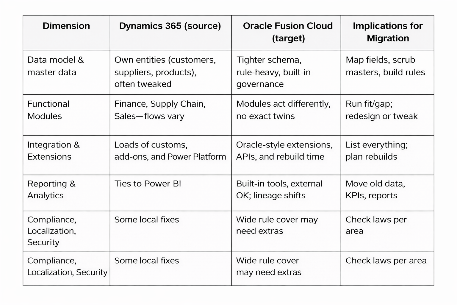 To plan a migration, you must understand how the two systems differ. Key areas to compare: Dynamics 365 vs Oracle Fusion Cloud: Key Differences & Considerations