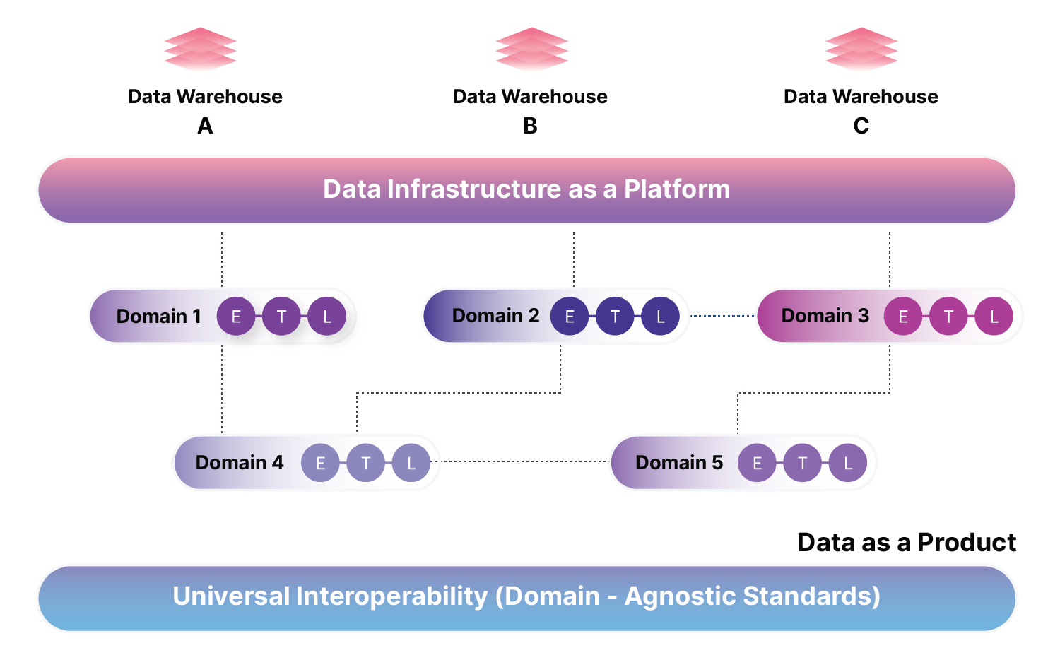 A Data Mesh decentralizes data ownership by treating data as a product and assigning domain-based ownership for scalability and agility.