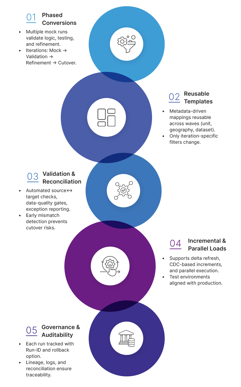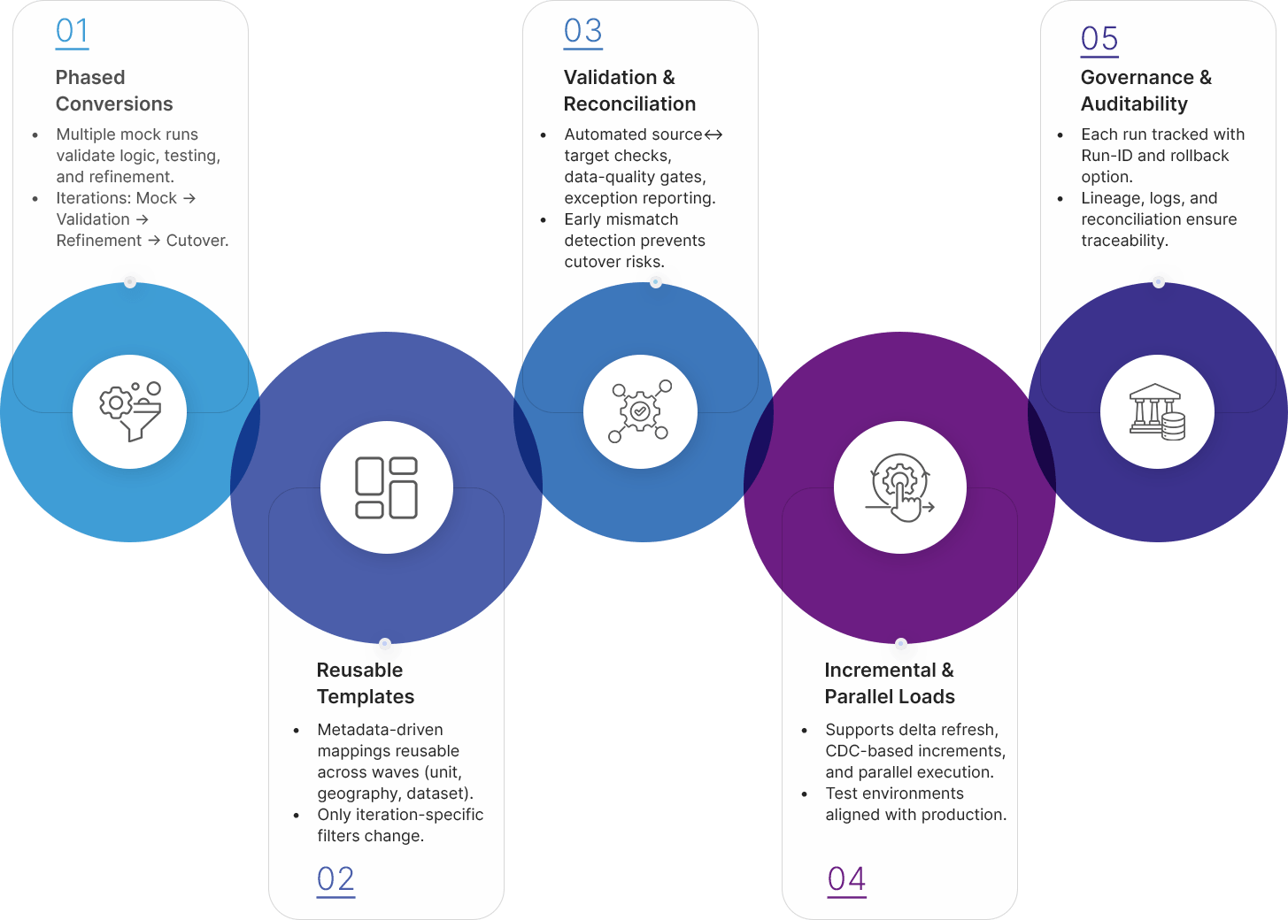 Automated source↔target counts, sums, referential checks, and exception packs.